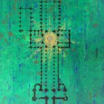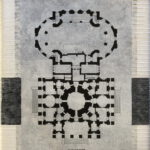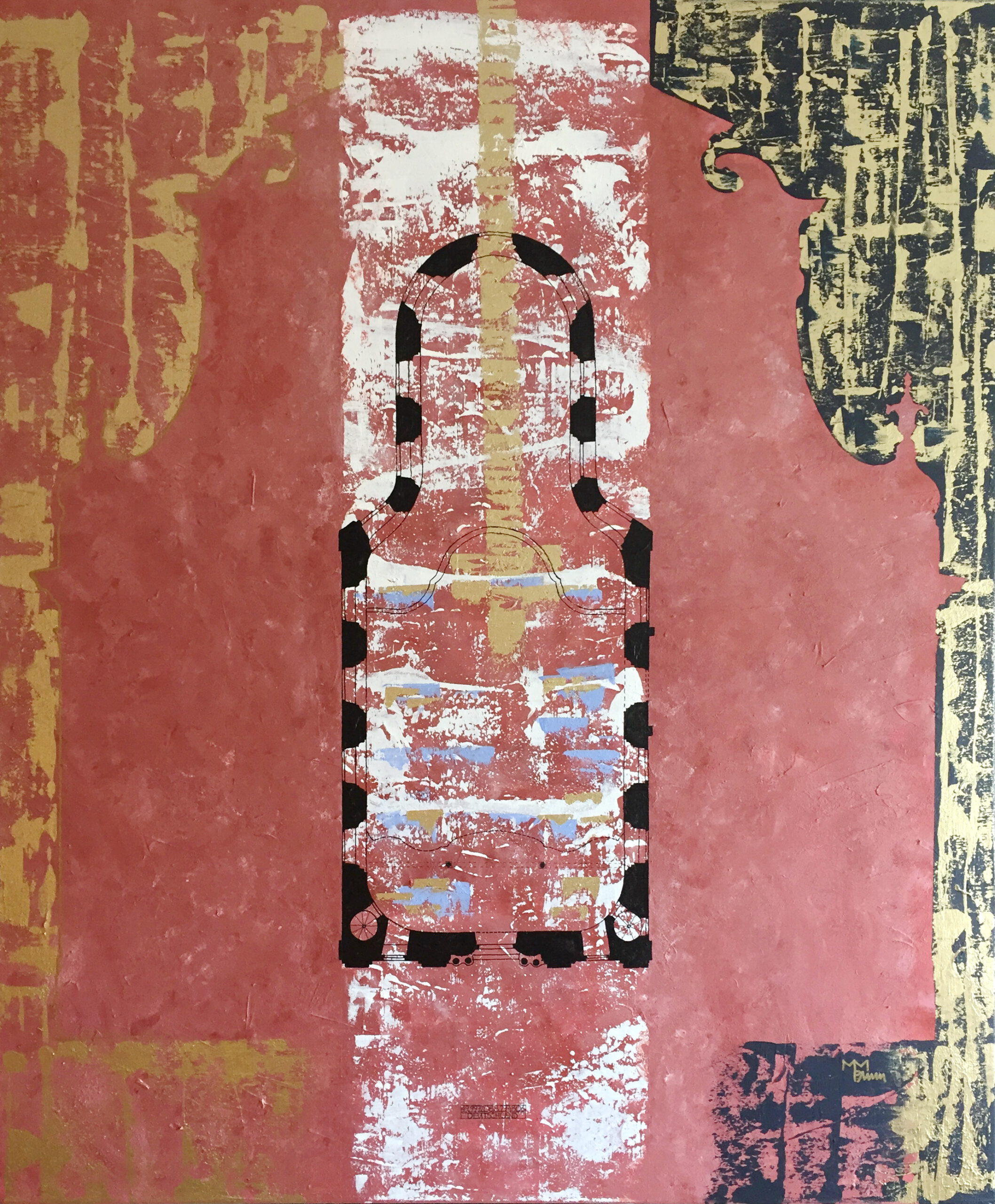 Der Hintergrund greift die rötliche Farbe des Sandsteins der Fassade und die glänzende Struktur des bestimmenden Marmorbodens im Kirchenraum auf. Die barocke Auffassung vom Kirchenraum als bildlich greifbarer Himmel auf Erden wird durch den breiten Streifen Weiß symbolisiert, unterbrochen von hellblauen Einsprengseln. Der Verlauf der Altarstufen folgt im Bild der ursprünglichen Architektur, der Schwung der Linie zeigt eher Zusammengehörigkeit als Trennung zwischen Altarraum und Chor. Die thematische Betonung des Messopfers im Bildprogramm der Kirche wird umgesetzt in einem Streifen von Gold, dem Einfall göttlichen Lichtes, in der Längsachse. Im Bereich des heutigen Altares bricht sich dieses Licht, eine neue Farbigkeit, das lichte Blau, entsteht, wo sich Mensch und Gott in diesem Geschehen begegnen.